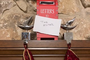 Image: A mailbox for letters to the editor on a mantle with Christmas stockings